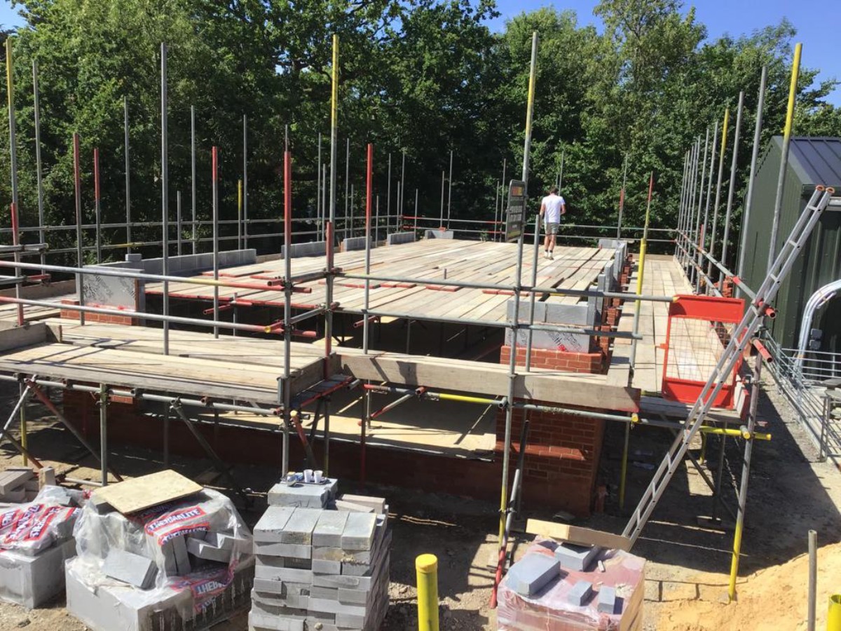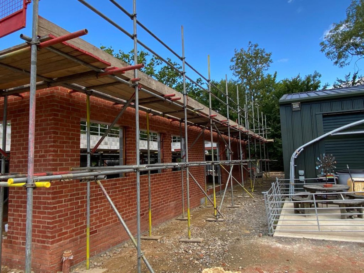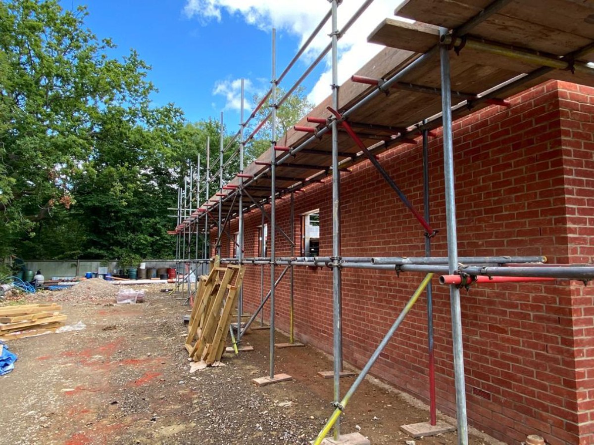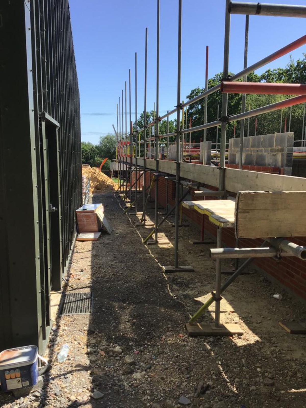 - Visit 3: Gable end scaffolding added with hop-ups on both ends for roofing and brickwork completion
