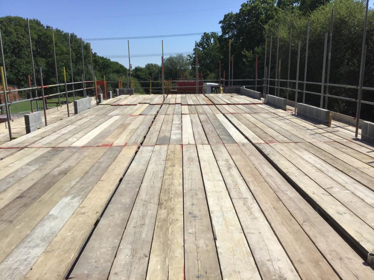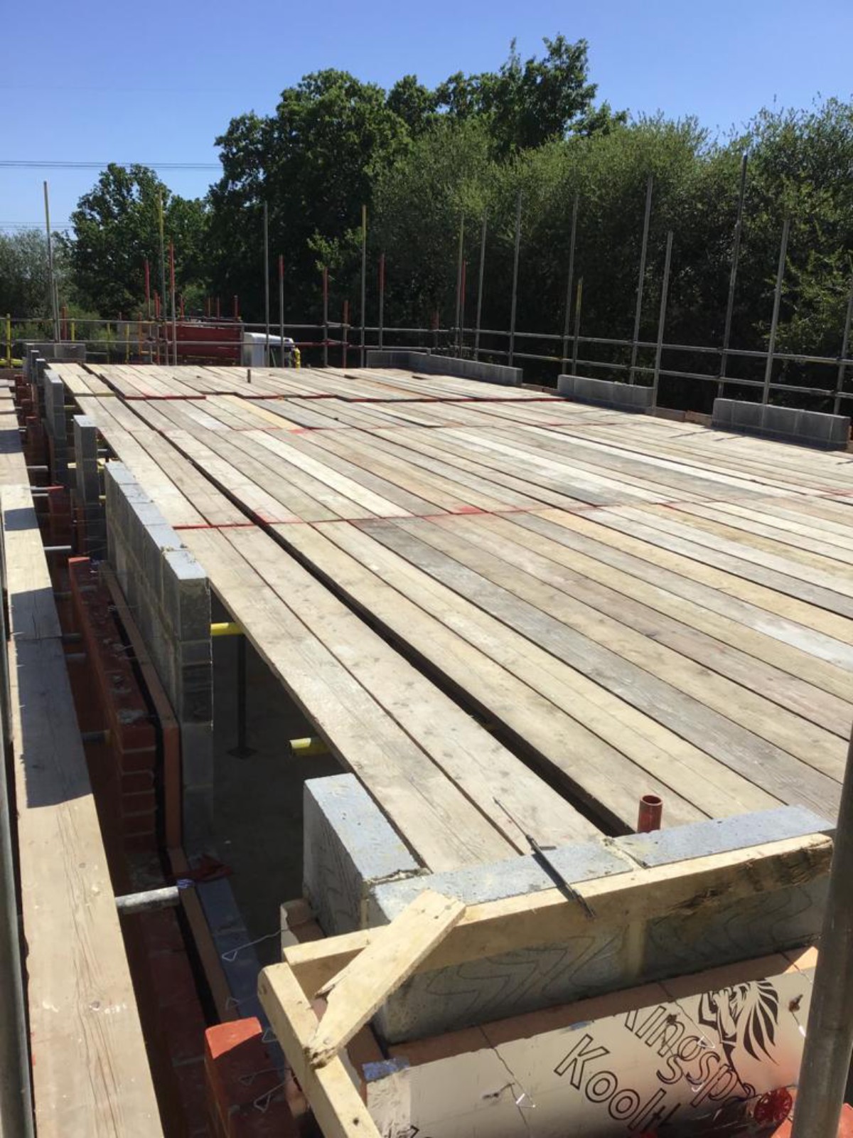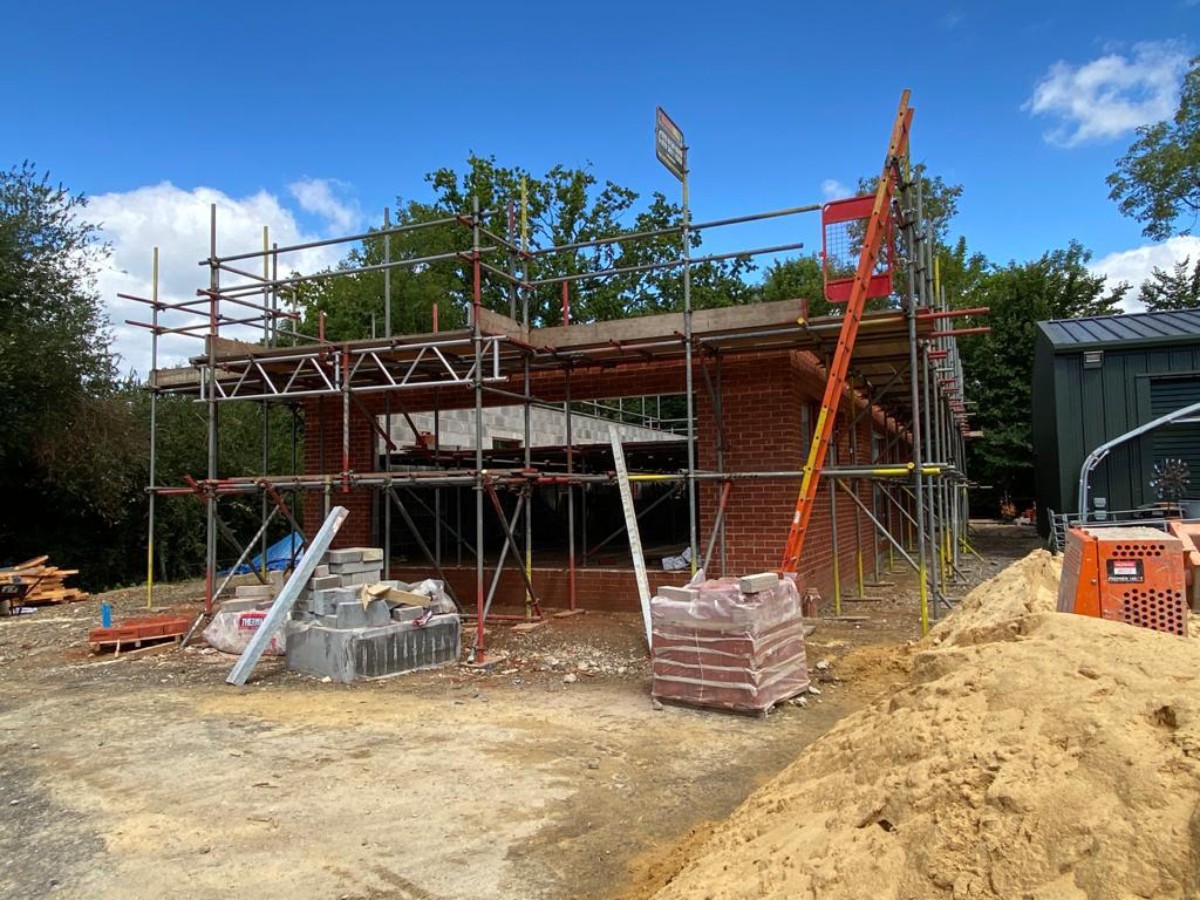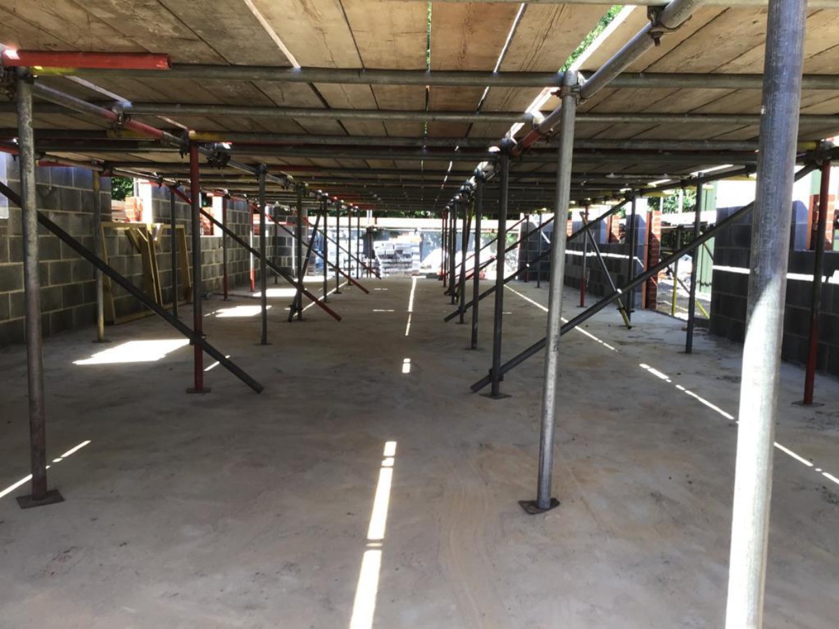 - Visit 3: Gable end scaffolding added with hop-ups on both ends for roofing and brickwork completion