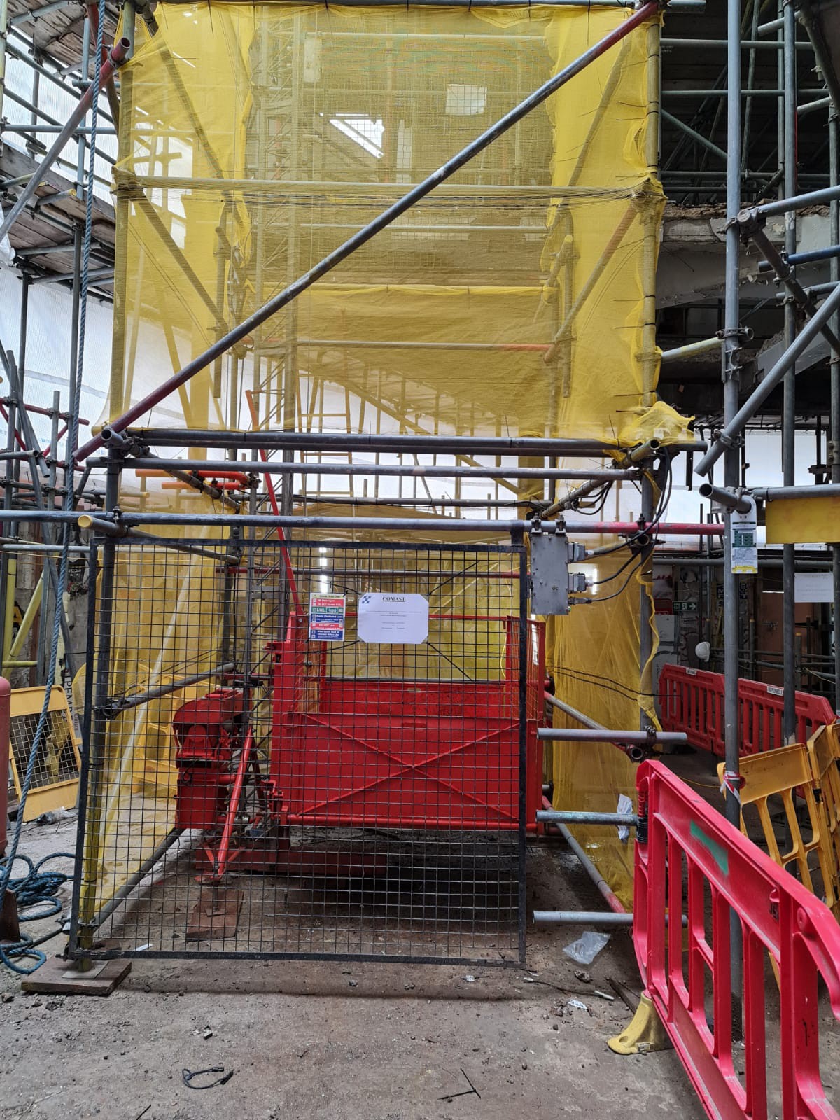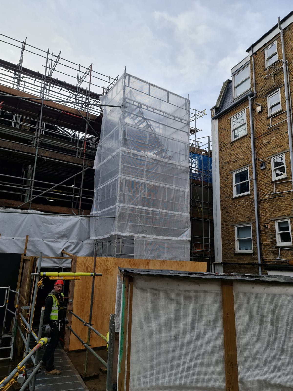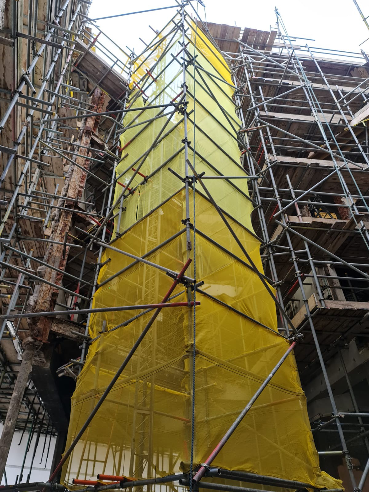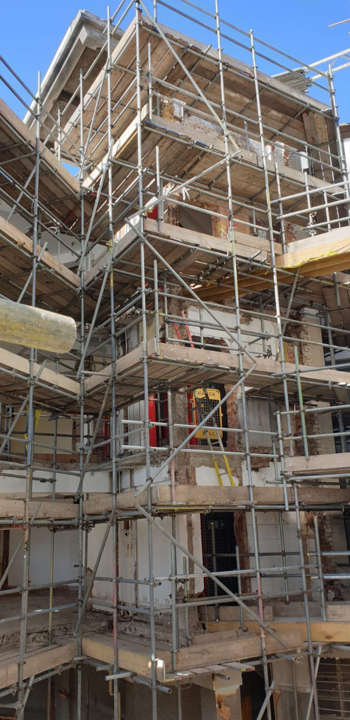 This complex, long-term project began in 2017 but experienced delays due to contractual issues. The scaffolding encompassed all elevations, fully boarded, and included a pedestrian splash fan and full temporary roof covering.