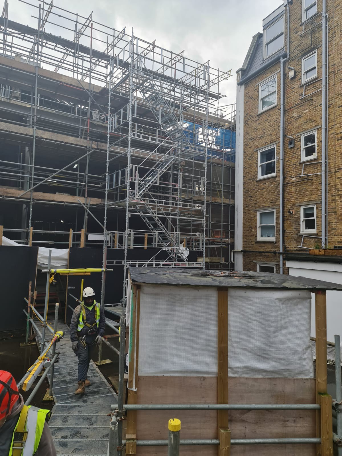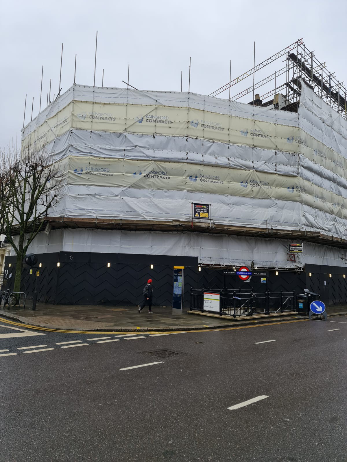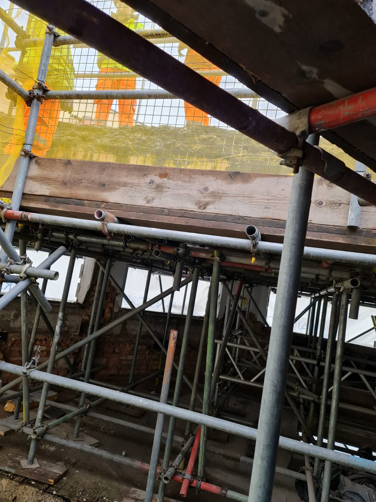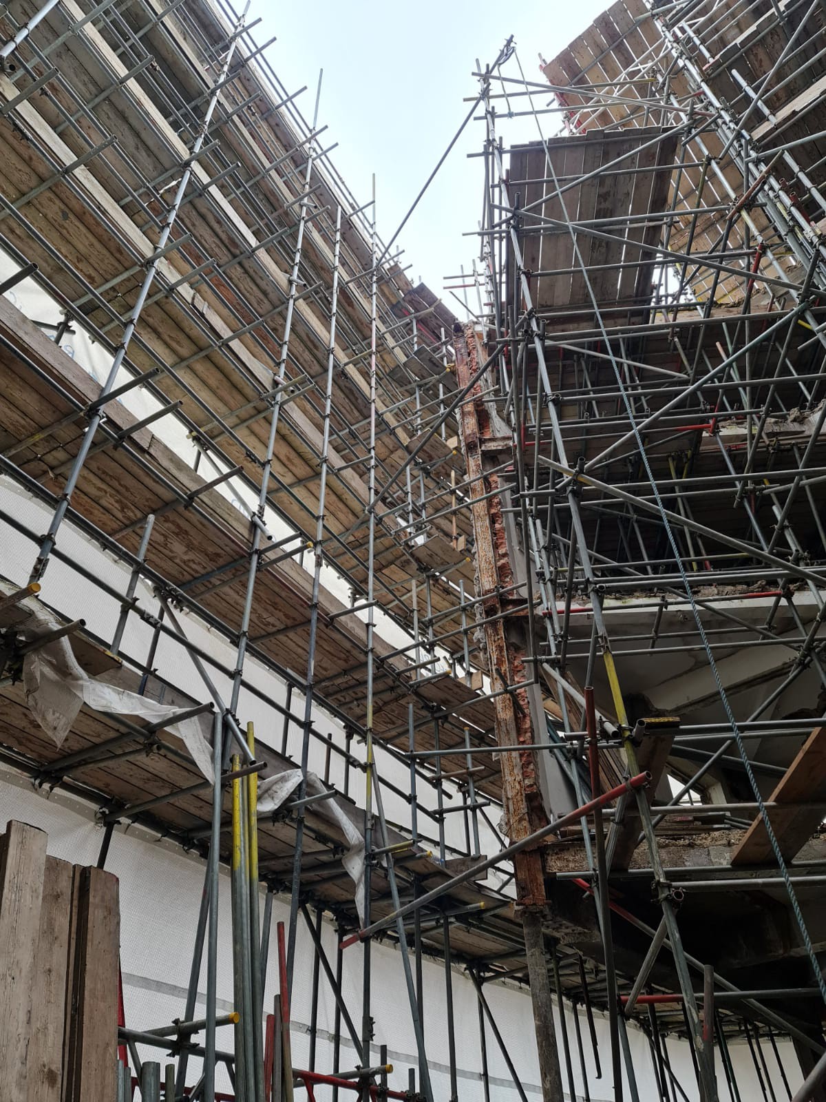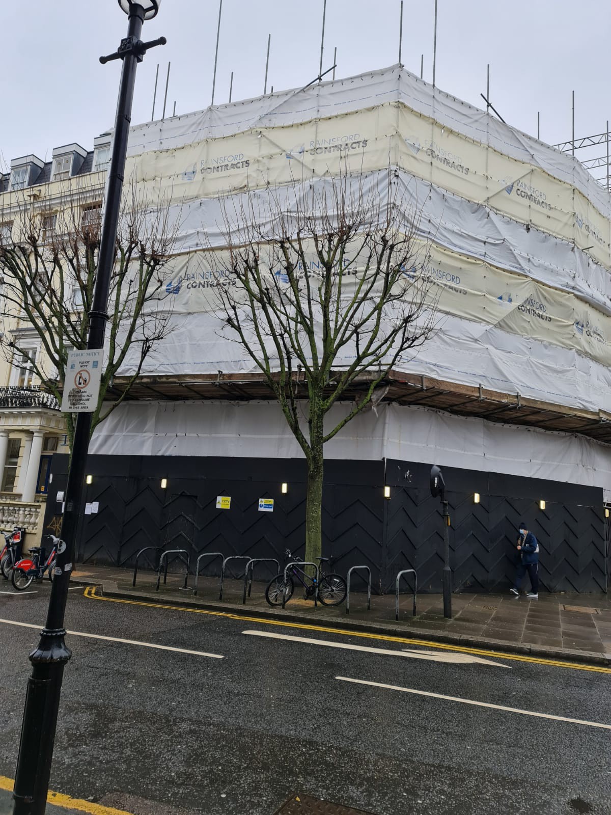 This complex, long-term project began in 2017 but experienced delays due to contractual issues. The scaffolding encompassed all elevations, fully boarded, and included a pedestrian splash fan and full temporary roof covering.